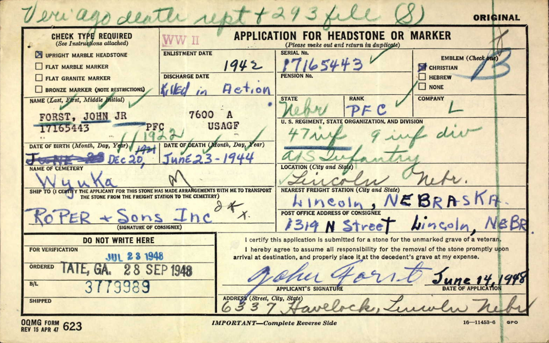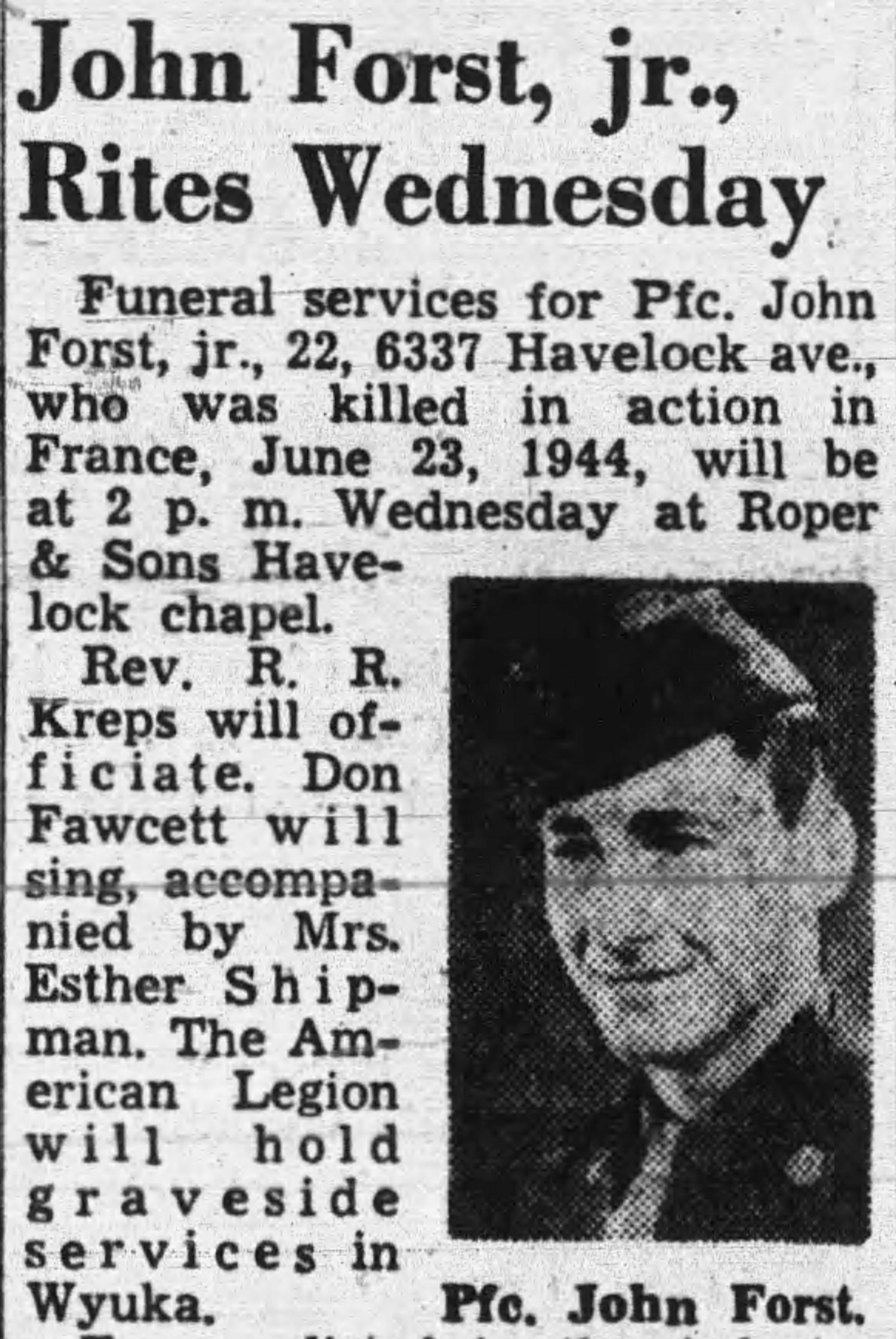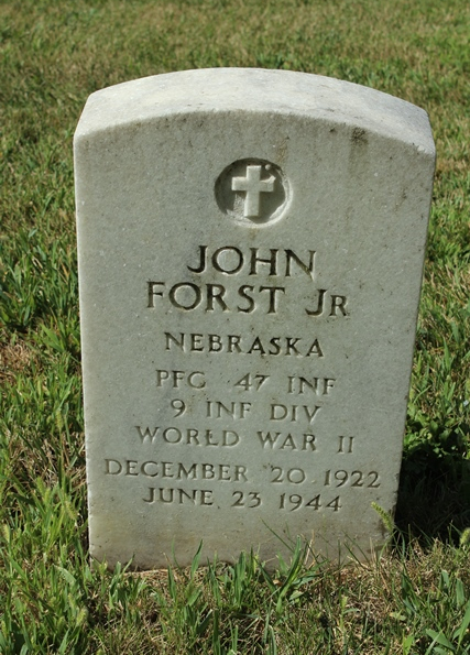 John vstupuje do armády 5.prosince 1942 jako dobrovolník. Svůj výcvik absolvuje v Camp Wheeler ve státě Georgia. V dubnu 1943 odchází jako voják 9th Infantry Division, 49th Infantry Regiment, Company L do války, aby se zapojil se svojí jednotkou do bojů v severní Africe. Pfc. John Forst Jr. je se svojí jednotkou účasten dalších válečných tažení v Sicílii a francouzské Normandii. Boje v Normandii se mu stávají osudnými a umírá v boji s nepřítelem dne 23. června 1944, pouhých 17 dní po Dni D.